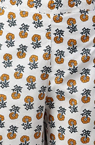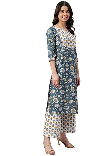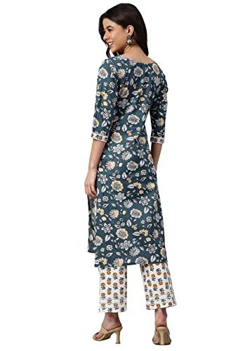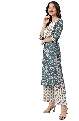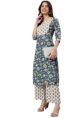 Yash Gallery Women's Polyester Calf Length Regular Fitted 3/4th Sleeve Floral Printed Anarkali Kurta with Zig-Zag Printed Pant & Dupatta