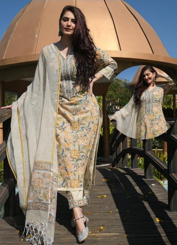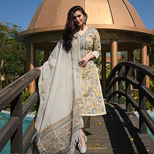 Yash Gallery Women's Cotton Embroidered Straight Kurta with Pant(SEA Green)