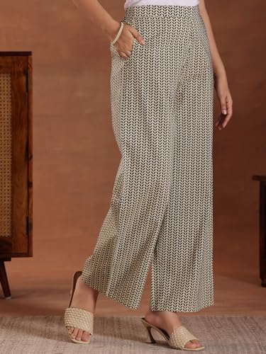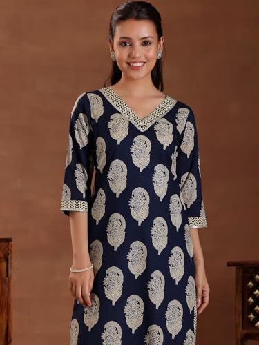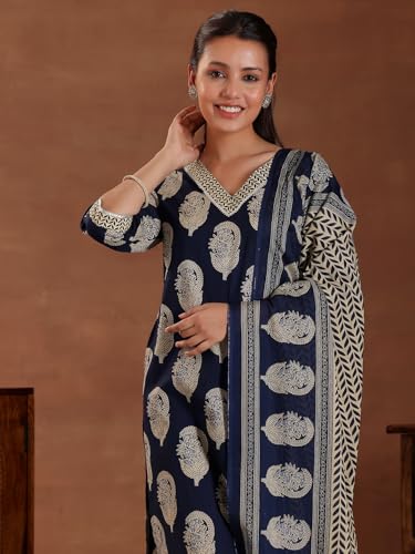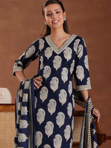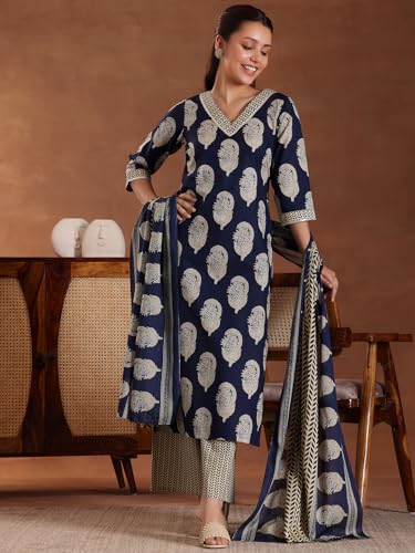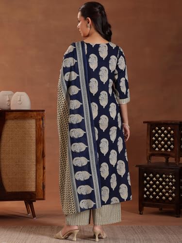 Libas Blue Printed Cotton Straight Kurta With Trousers & Dupatta