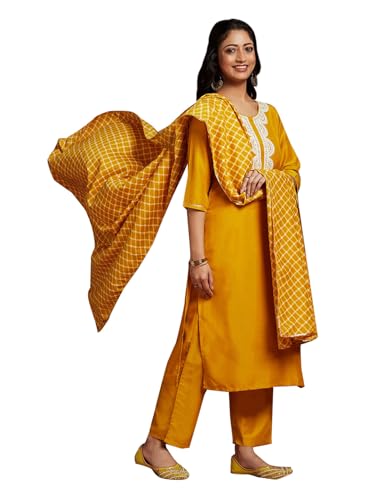 Janasya Women's Mustard Chanderi Floral Printed Straight Kurta Set