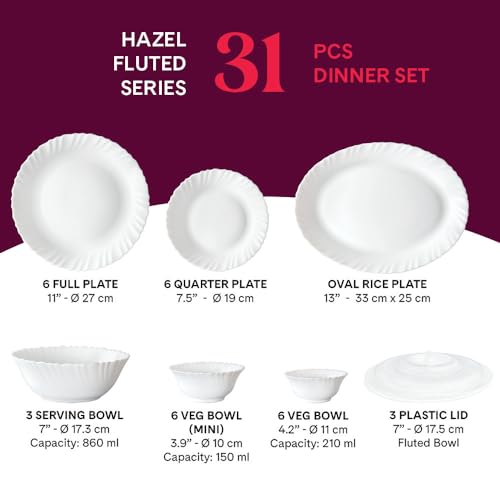 Larah by Borosil Nargis Fluted Series Opalware Dinner Set | 21 Pieces for Family of 6 | Microwave & Dishwasher Safe | Bone-Ash Free | Crockery Set for Dining & Gifting | Plates & Bowls | White