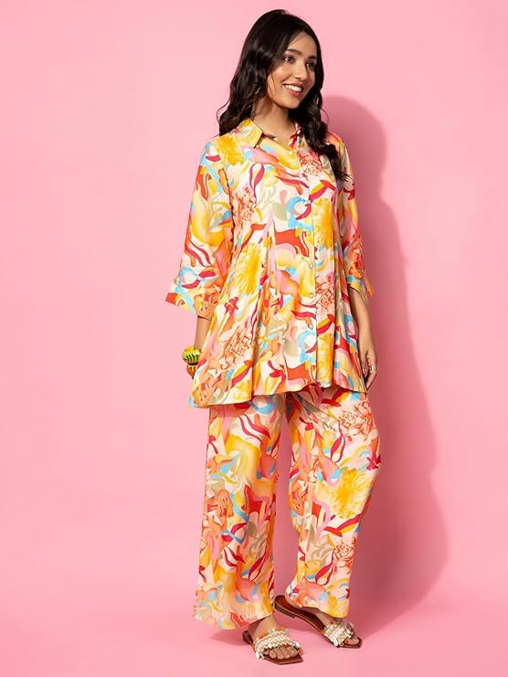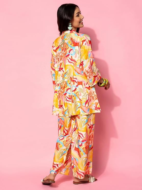 Libas Pink Printed Silk Blend Straight Kurta With Palazzos