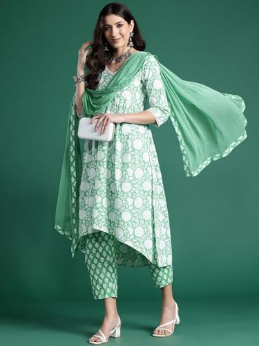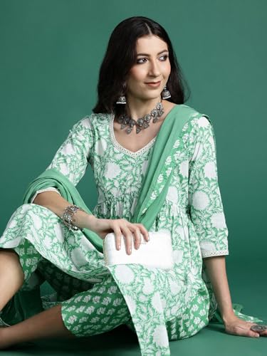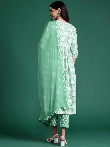Janasya Women's Aqua Pure Cotton Floral Printed Angrakha Co-ord Set